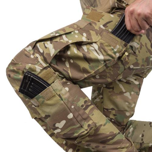 Дана модель має шість кишень - дві прорізні передні, дві задні, дві накладні настегнові та дві в нижній частині штанин. Накладні об'ємні кишені мають захисний клапан на липучках. Крім того, в горловині даних кишень розташовані еластичні утяжки, які перешкоджають мимовільному випаданню спорядження. Кишені в нижній частині штанин закриваються на клапан з липуч