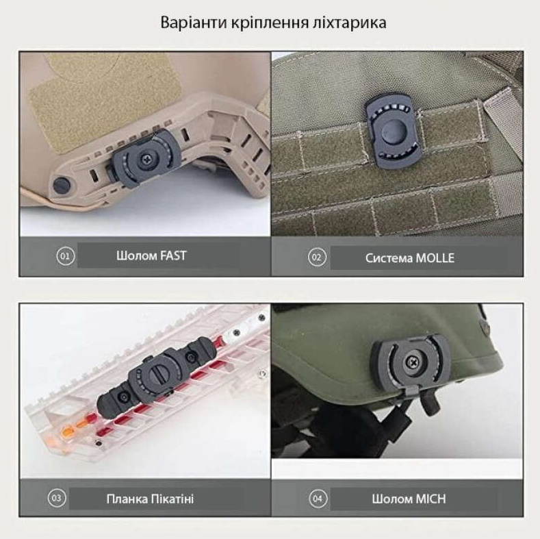 Ліхтар підходить для більшості шоломів типу MICHT, FAST та аналогів. Кріпиться збоку на рейку, або напряму до шолома (в комплекті є кріплення). Також є кріплення на стропи MOLLE/PALS або на зброю.